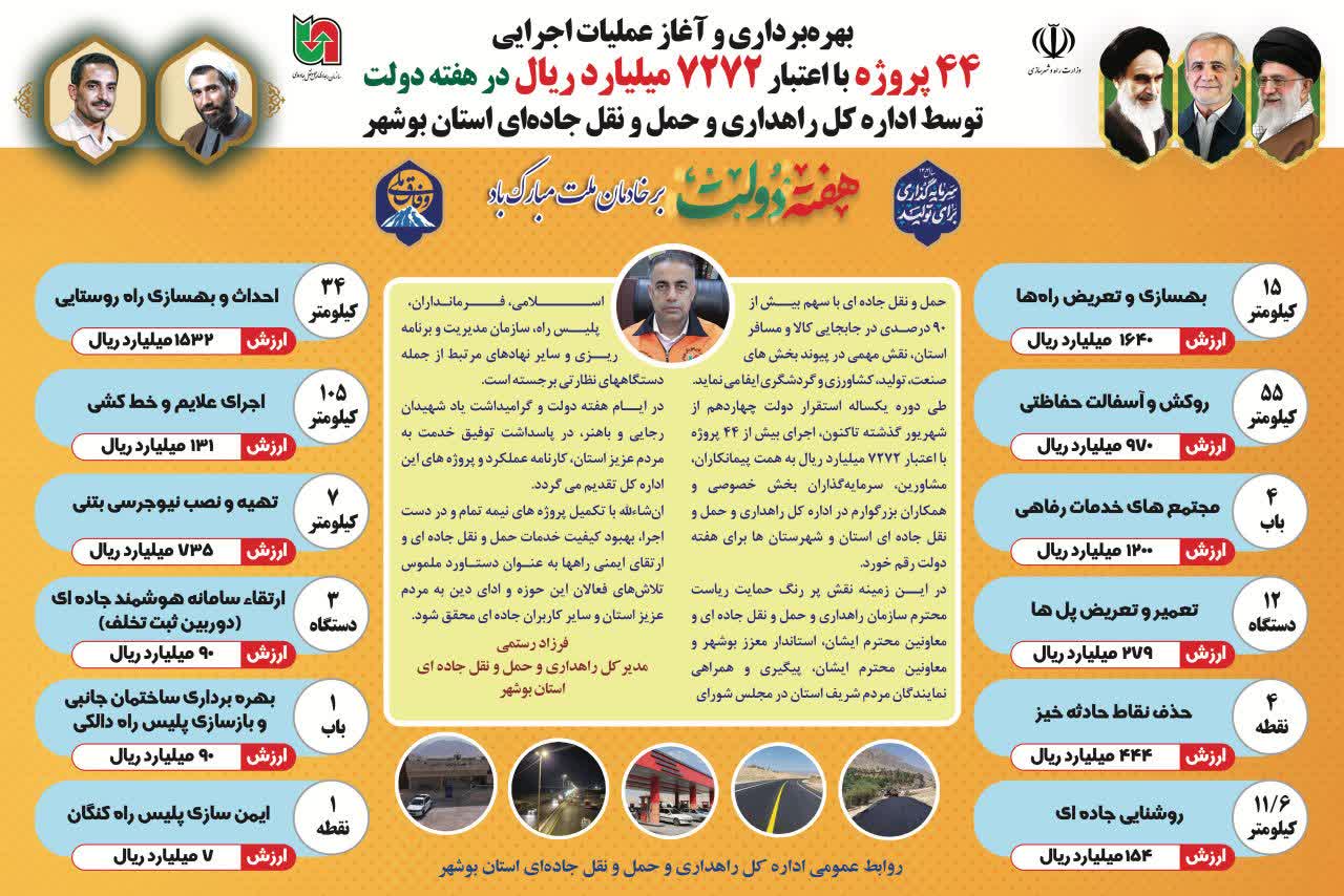 مدیرکل راهداری و حمل و نقل جادهای بوشهر درخصوص پروژههای شاخص راهداری خاطرنشان کردد: افتتاح ۴ مجتمع خدمات رفاهی با سرمایهگذاری ۱۲۰ میلیارد تومان، حذف نقطه پرتصادف پیچهای برق در گردنه «دالکی- کنارتخته» با اعتبار ۴۳ میلیارد تومان، فاز سوم تعریض و بهسازی محور «سنا- ناصری- شنبه» دشتی با اعتبار ۵۶ میلیارد تومان، فاز دوم بهسازی پیچهای «جاشک» با اعتبار ۴۱ میلیارد تومان، تبدیل نیوجرسی بتنی به جای گاردریل در محور «بوشهر- برازجان» با اعتبار ۵ .۷۳میلیارد تومان و شروع فاز دوم تعریض و بهسازی محور «دهرود-تنگ ارم» دشتستان با اعتبار ۴۷ میلیارد تومان از پروژههای مهم این اداره کل در هفته دولت امسال است.