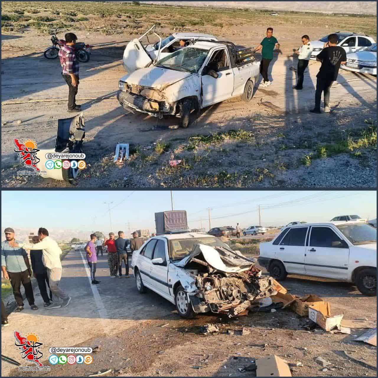 وی افزود: این حادثه ساعت ۱۷:۰۷ روز چهارشنبه، روبهروی شهرک صنعتی برازجان و در پی برخورد یک دستگاه پژو پارس با یک دستگاه وانت پراید رخ داد که منجر به مصدومیت دو نفر از رانندگان خودروها شد.