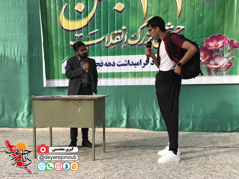 به گزارش دیارجنوب، این مراسم در مدرسه شهید اصغر عدالت همراه با مسابقه ، قرعه کشی و اجرای گروه طنز کلخنگ ، سرود دختران زینبی و پسران نوای حقیقت برگزار شد.